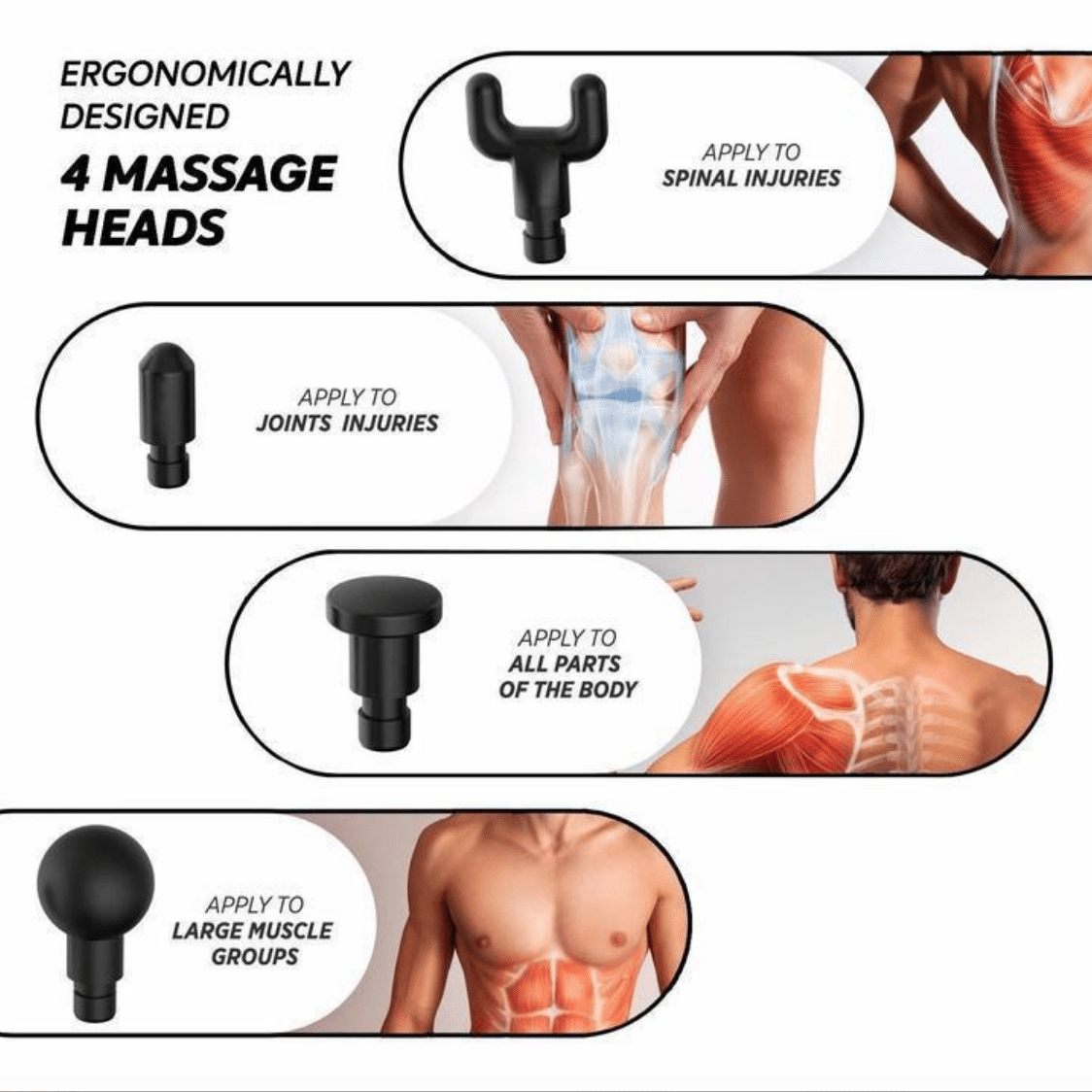Offers 6 speed settings and 4 interchangeable head attachments for a customized massage. Adjust the speed and massage heads to your liking!