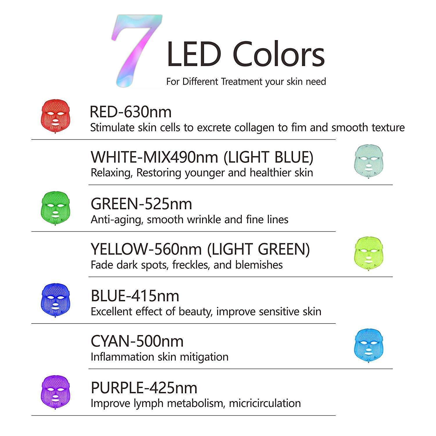 - Red: Anti-Aging, Promotes Collagen, Tightens loose skin, Increases elasticity, Revitalizes Cells, Improves Blood Circulation